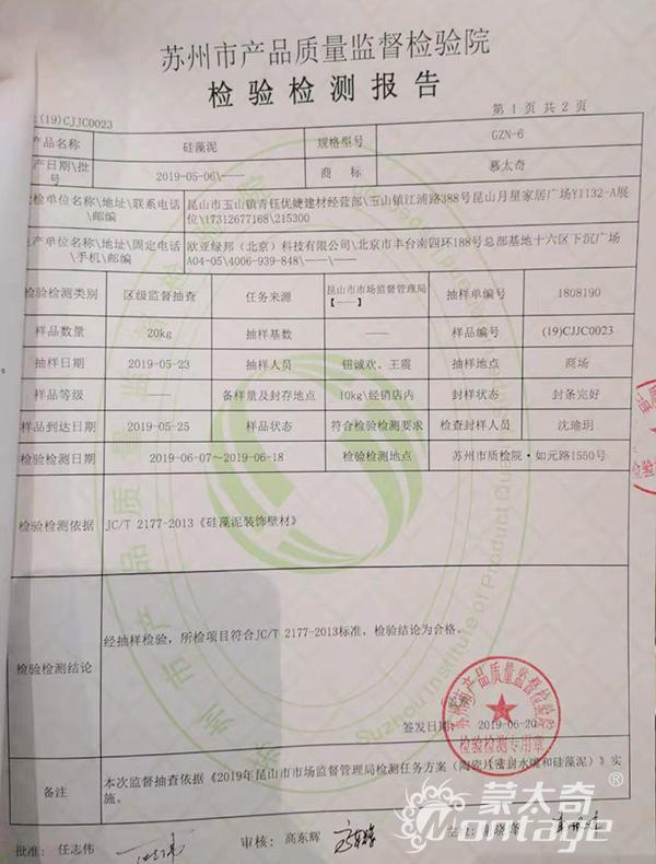 2019年5月,昆山市市場監督管理局對蒙太奇硅藻泥產品進行監督抽查。檢驗檢測結果顯示,蒙太奇硅藻泥產品未檢測出游離甲醛含量、可溶性重金屬以及苯、甲苯、乙苯、二甲苯有害物質。