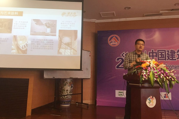 會議中趙總與各位領導和嘉賓分享了《淺談中國藝術涂料現狀》,主要講述內容包括:“何為藝術涂料”“歐美藝術涂料的發展與現狀”“中國藝術涂料的發展與現狀”“藝術涂料的分類與裝飾特點”“藝術涂料的裝飾應用于案例展示”“蒙太奇硅藻泥藝術涂料的優勢”等,趙總給出了很多建設性的意見和建議,旨在為推動藝術涂料行業發展貢獻蒙太奇品牌的力量。